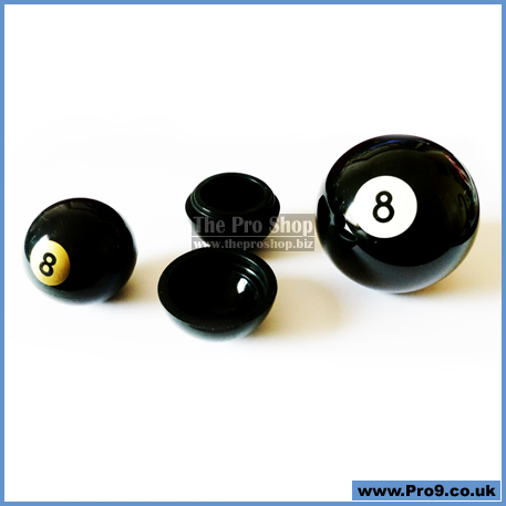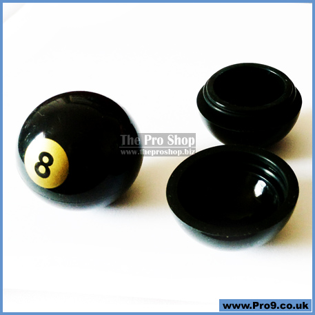 Black silicon rubber with a golden 8-ball symbol, splits in half to reveal secret small storage area.