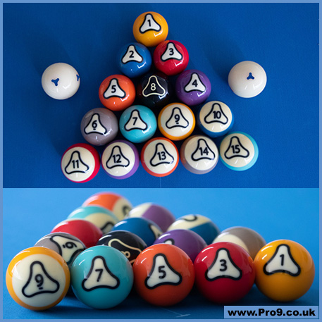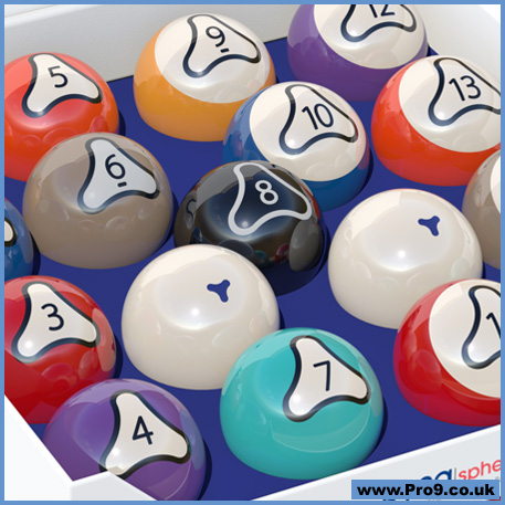 Each cue- ball is marked with 6 blue Rotor™ for increased feedback on spin. The Rotor™ design is integrated in every “solid” and “striped” ball