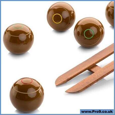 A set of composition 2 1/4" table bowls consisting of 4 pairs of bowls each with the same bias. Supplied with jack chute and 1 3/8" white jack. Designed for playing on a full 9 foot size pool table.