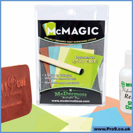 Sprinkle Shaft Cleaner on a clean, damp cloth. Wipe down cue shaft. Repeat if necessary. Wipe off residue with clean, damp cloth. Use Renew Shaft Cleaner before McMagic Micro Burnishing Papers. Then use Ultra-Glide Shaft Conditioner to seal and polish the shaft.