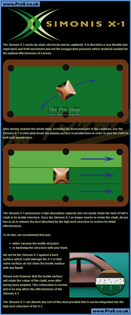 For regular maintenance of the playing surface i.e. the removal of chalk dust, you will no longer need a traditional brush that only moves this dust around on the cloth, nor daily use of a vacuum cleaner that may damage the cloth and the use of which is therefore impractical, nor a maintenance product that is likely to stretch or discolour the cloth or alter its properties. The Simonis X-1 deeply extracts the chalk dust from the baize and retains it in its revolutionary high-tech structure!