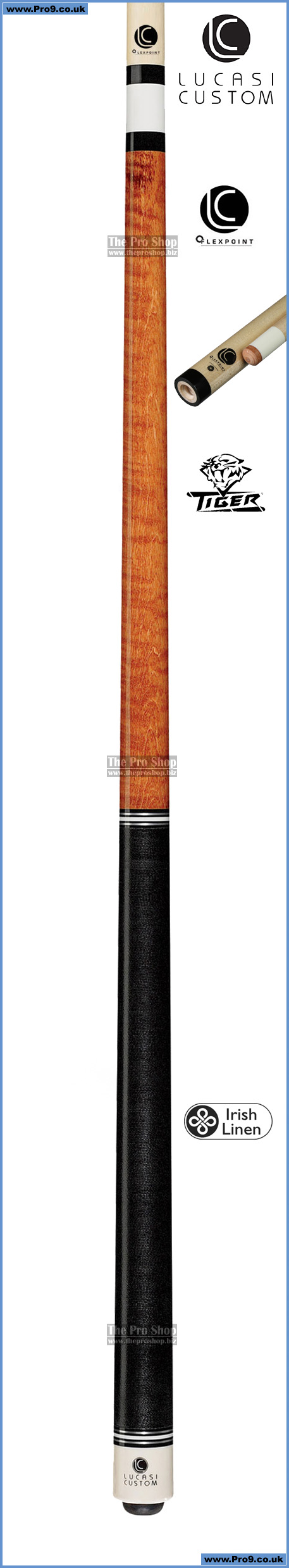 Lucasi Custom cues come standard with premium layered Tiger Everest tips – they hold their shape like a hard tip, hit like a medium tip and control like a soft tip – giving you almost unmatched ball control.