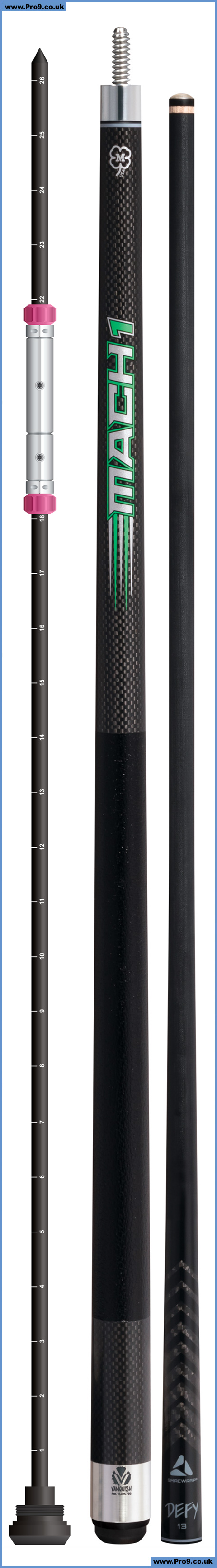 Introducing the Vanquish Mach 1 — the most technologically-advanced break cue. This state-of-the-art carbon fiber butt features our patented Variable Balance Point technology, which allows you to fine tune the weight and balance of your cue. This allows you to set the cue to be front-weighted, rear-weighted or anywhere in between! The Mach 1 comes equipped with our newly-engineered Defy break shaft with a Navigator Break Impact tip and phenolic ferrule for maximum power and control.