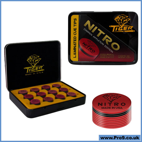 The NITRO Laminated Cue Tip is the result of a groundbreaking collaboration between Tiger Products and World Champion & BCA Hall of Famer Darren "Dynamite" Appleton. Engineered for ultimate consistency, precision, and explosive performance, this medium-hard tip offers the perfect balance of feel, control, power, and spin—making it ideal for players of all levels.