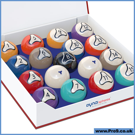 Each cue- ball is marked with 6 blue Rotor™ for increased feedback on spin. The Rotor™ design is integrated in every “solid” and “striped” ball