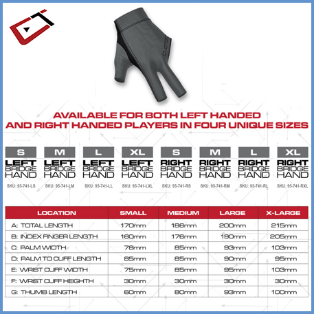 Your bridge is an important part of your game’s foundation, and on-table success is built on that same solid foundation. Axis Gloves feature a durable, ultra low-friction surface paired with cool-flow breathable mesh that is reinforced with double stitching to provide players with a smoother and more consistent stroke. The result is a better foundation to give your game the X-factor. See the size chart below to locate your perfect fit.