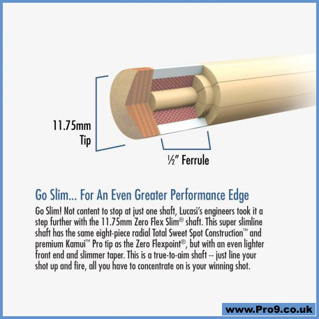 Lucasi Hybrid Zero Flex Slim shafts take the performance of the Zero Flex technology one step further. This super slim line shaft offers all of the features of the original Zero Flex shaft with a smaller 11.75mm tip with a European (straight) taper for a true-to-aim shaft that provides the maximum amount of cue ball control.